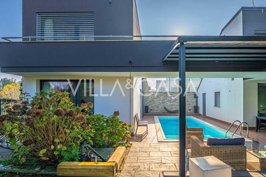 Ferrara şehrinin kalbinde, bakımlı yeşilliklerle çevrili, 2014 yılında inşa edilmiş modern bir ev satışa sunulmuştur. Toplam alanı yaklaşık 360 m² olan bu ev, iki bağımsız bölümden oluşmaktadır: ana ev ve ayrı bir misafir evi. Bu bölümler, ikinci katta geniş bir ortak teras ile birbirine bağlanarak tek bir alan hissi yaratmakta ve bahçe ile dinlenme alanına harika bir manzara sunmaktadır.