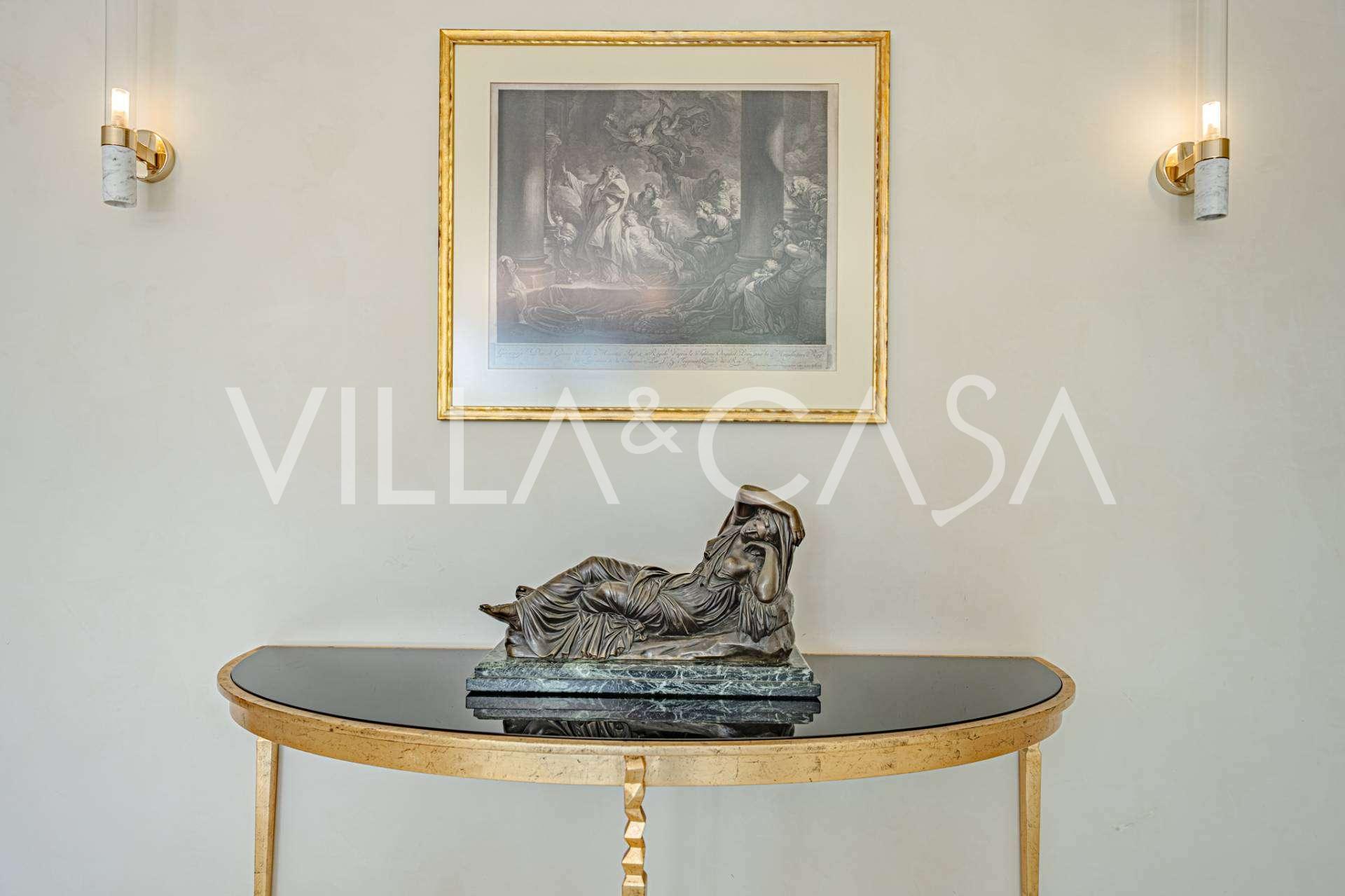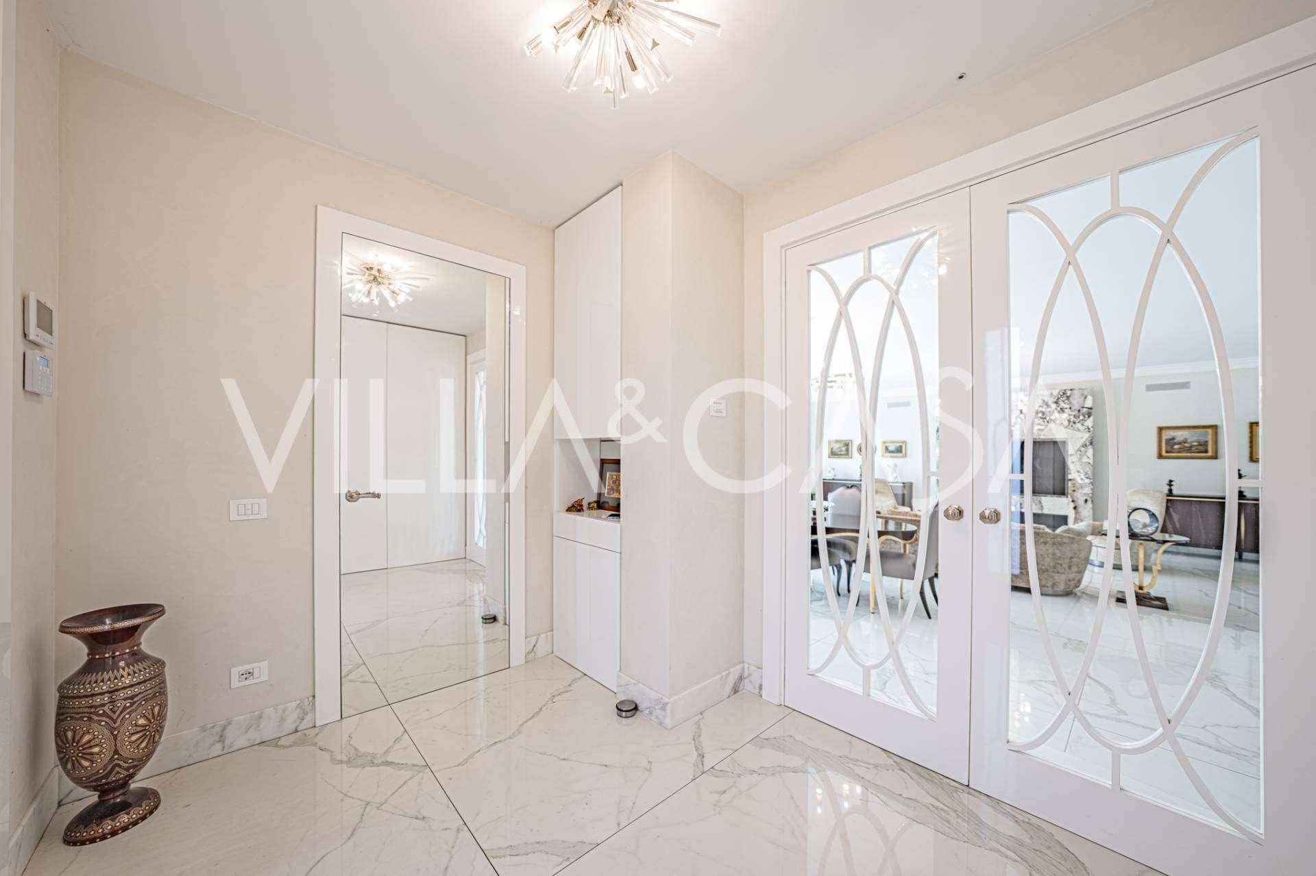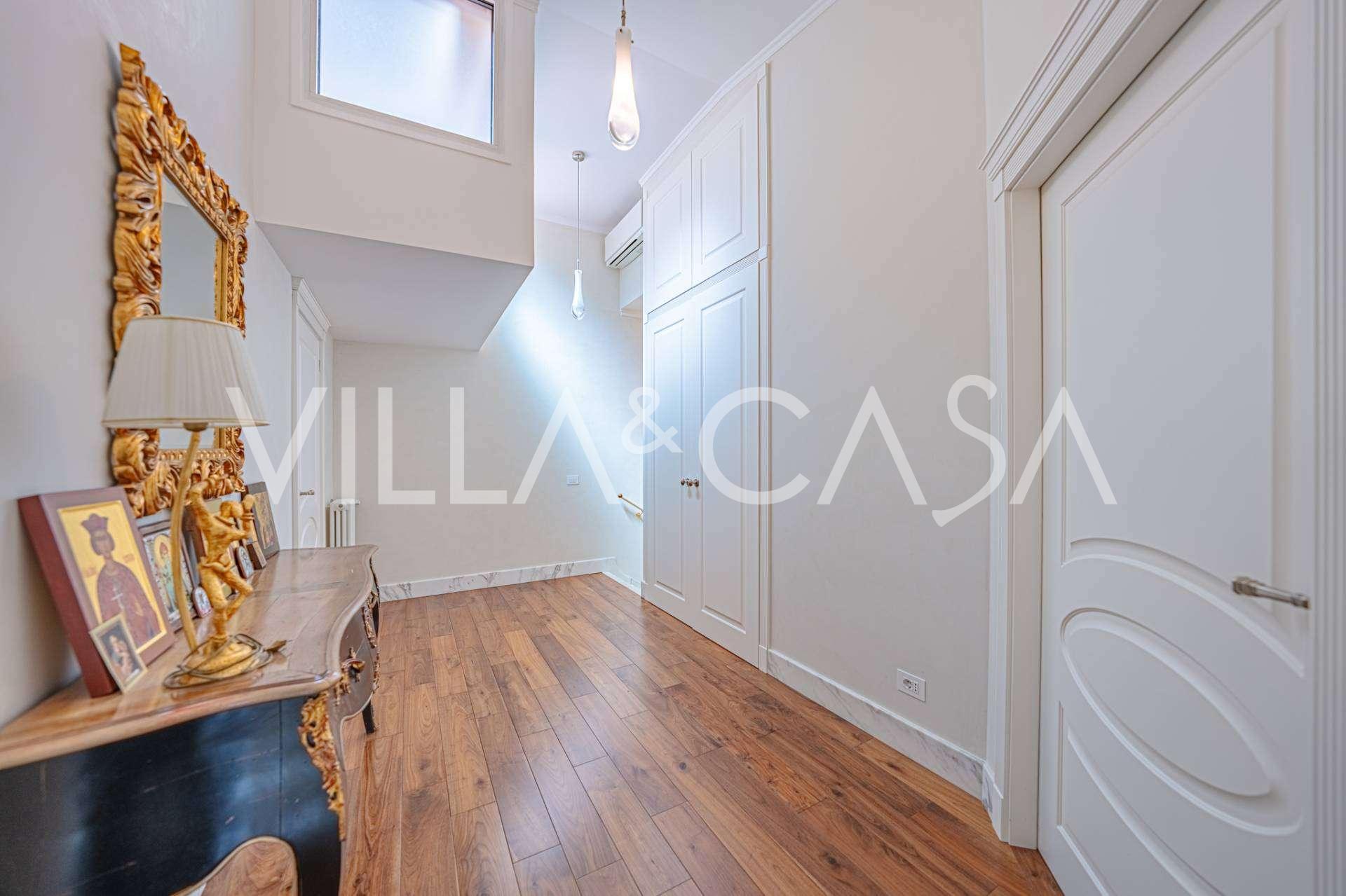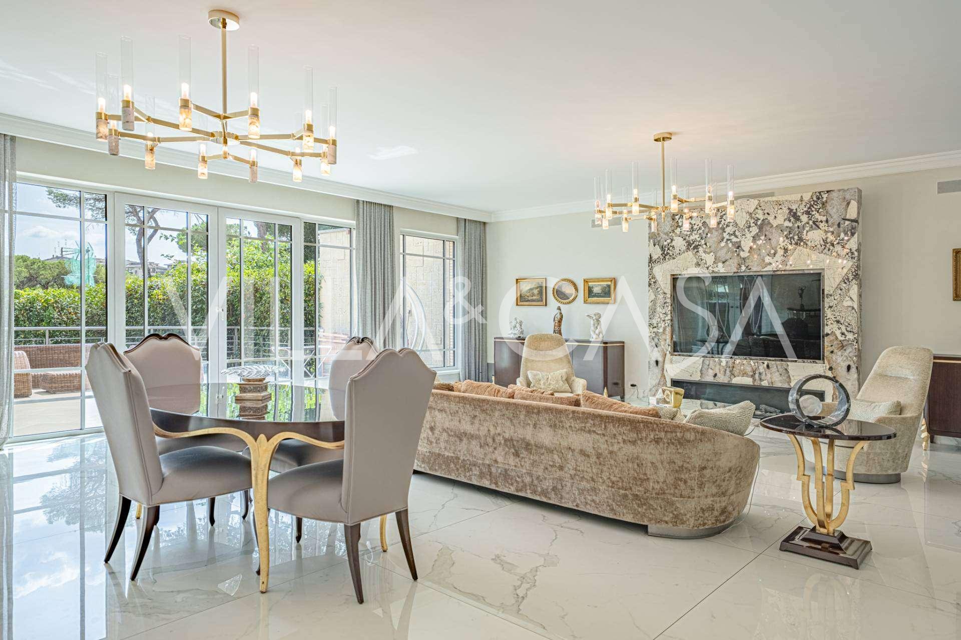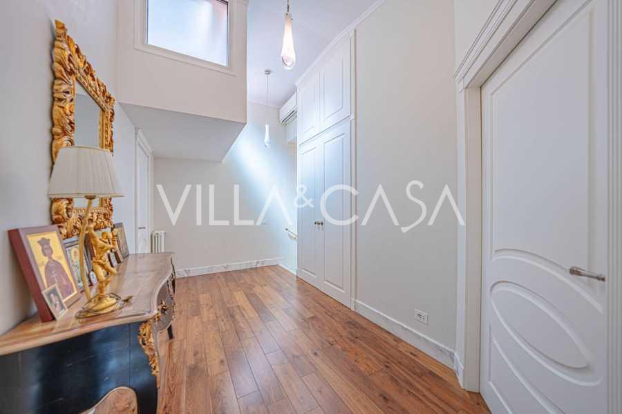 Üç katlı konut, Via Marocco'da güney güneşine bakan bir konumda yer almakta, yeşilliklerle çevrili olup bahçelere nefes kesici manzaralar sunmaktadır. Tarihi tarz, yenilikçi teknolojiler ve iç mekanın özenle düşünülmüş ergonomisi ile uyumlu bir şekilde birleşmektedir.