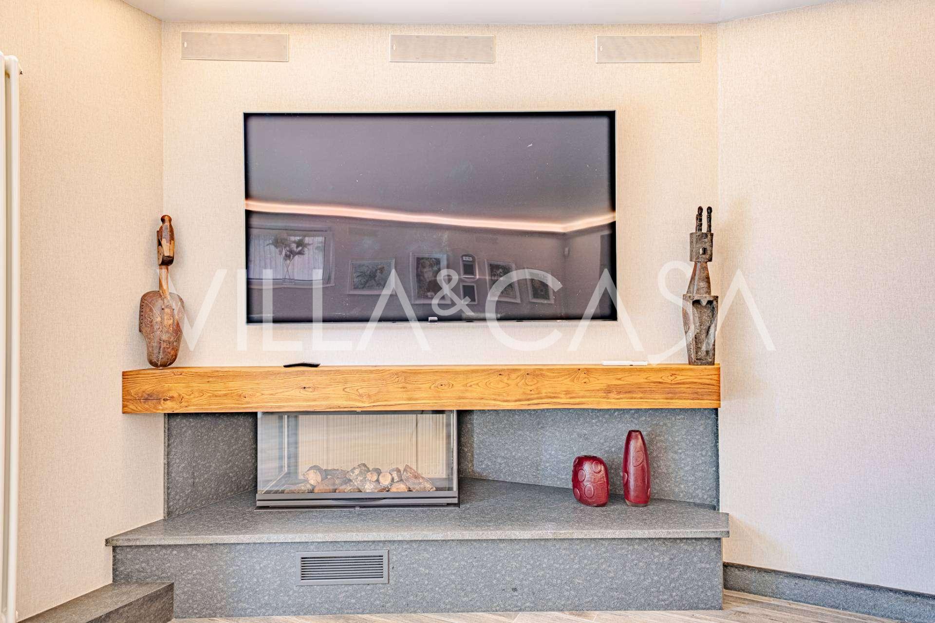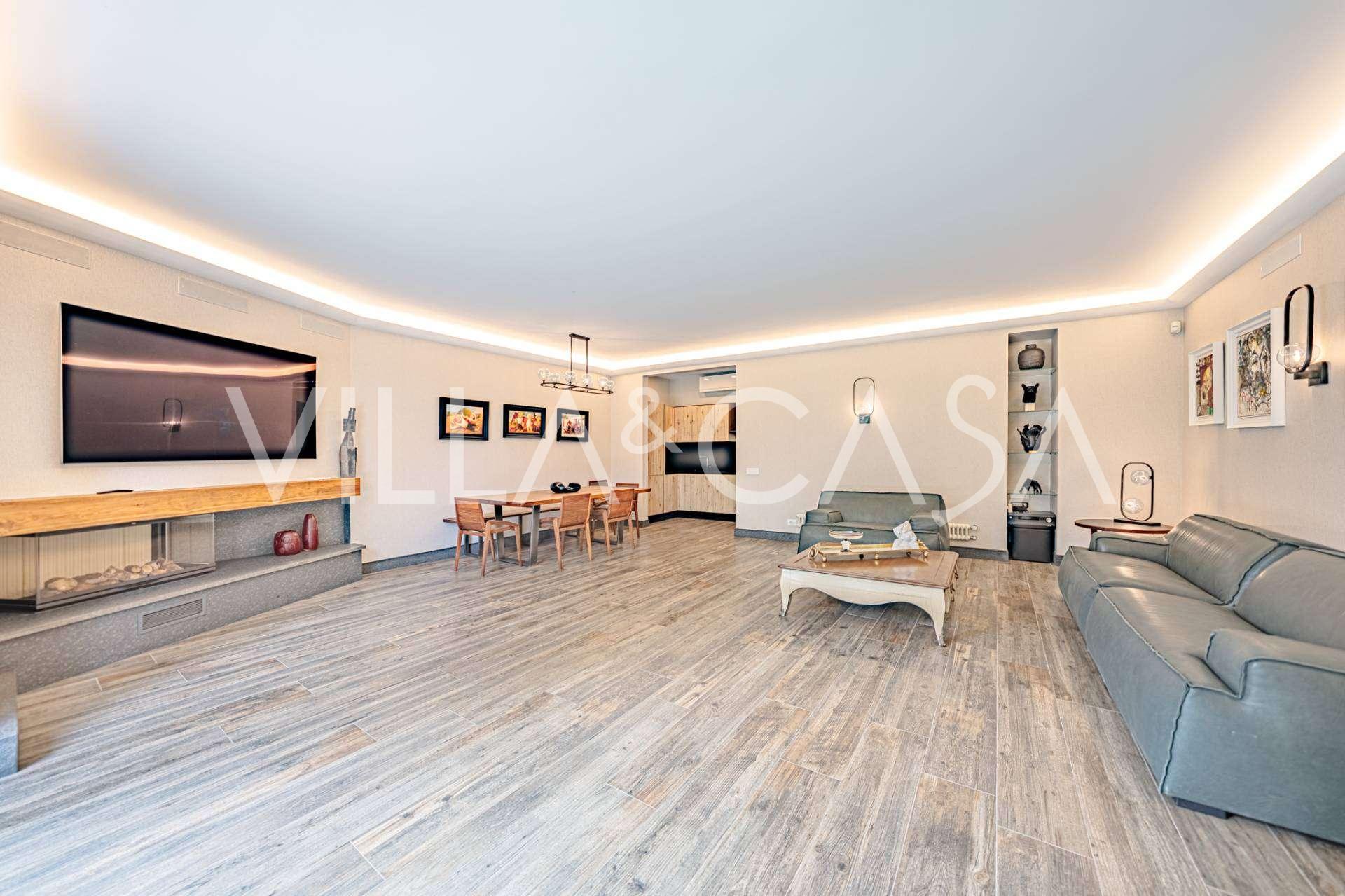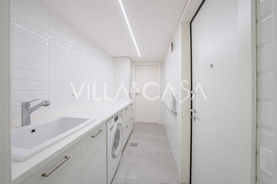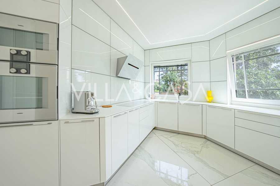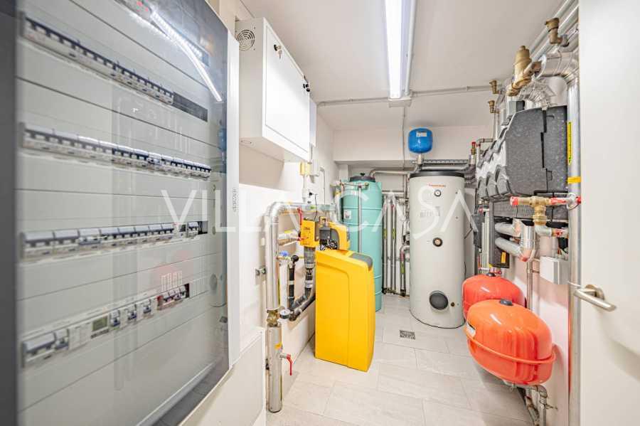 Birinci kat: şık bir giriş holü, tasarım biyokaminli ve terasa açılan panoramik pencereli geniş oturma odası; önde gelen markaların ekipmanları ile donatılmış ultra modern mutfak; ayrı hizmet alanı (çamaşırhane, teknik oda, doğrudan eve erişimi olan ısıtmalı garaj); kendi mutfağı ve banyosu olan özel bir çalışma odası.