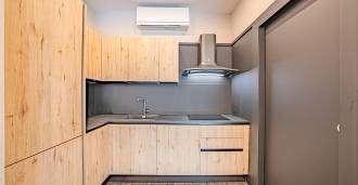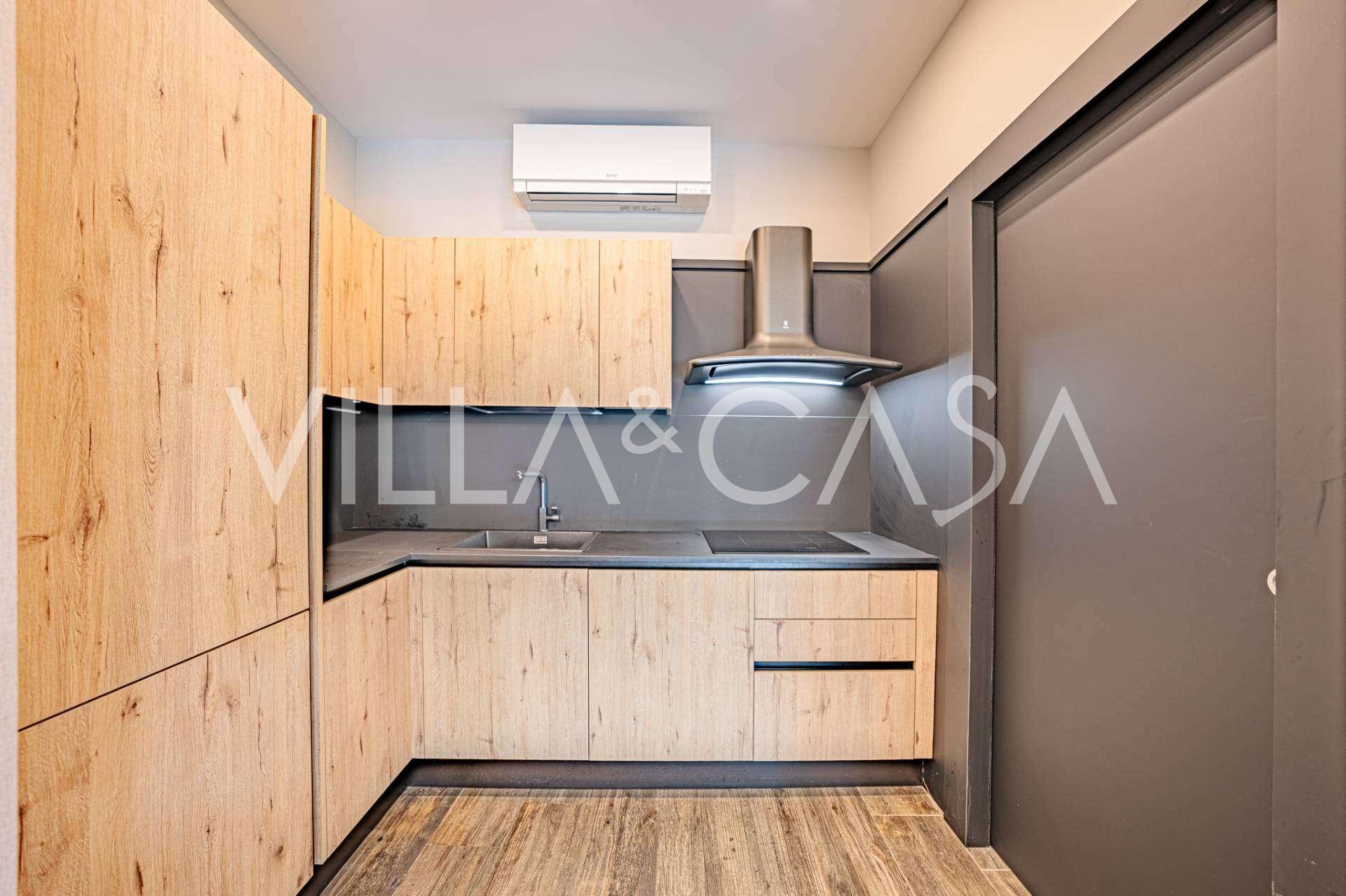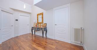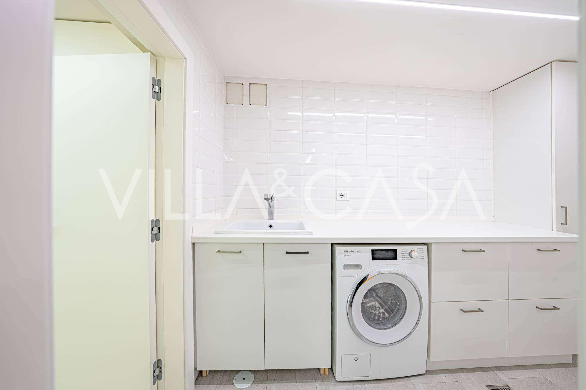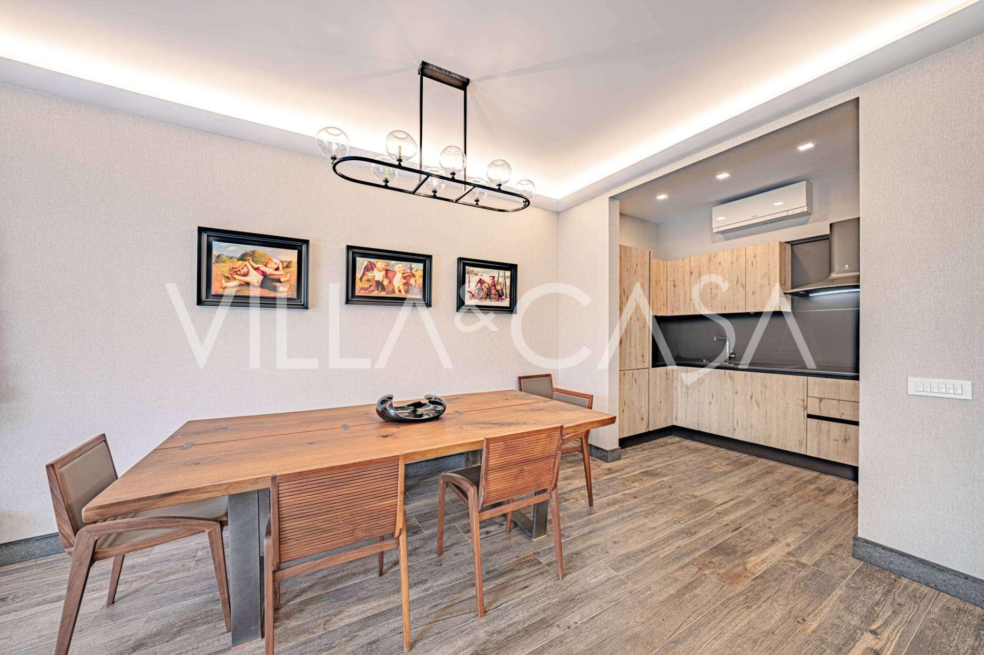 Birinci kat: şık bir giriş holü, tasarım biyokaminli ve terasa açılan panoramik pencereli geniş oturma odası; önde gelen markaların ekipmanları ile donatılmış ultra modern mutfak; ayrı hizmet alanı (çamaşırhane, teknik oda, doğrudan eve erişimi olan ısıtmalı garaj); kendi mutfağı ve banyosu olan özel bir çalışma odası.