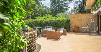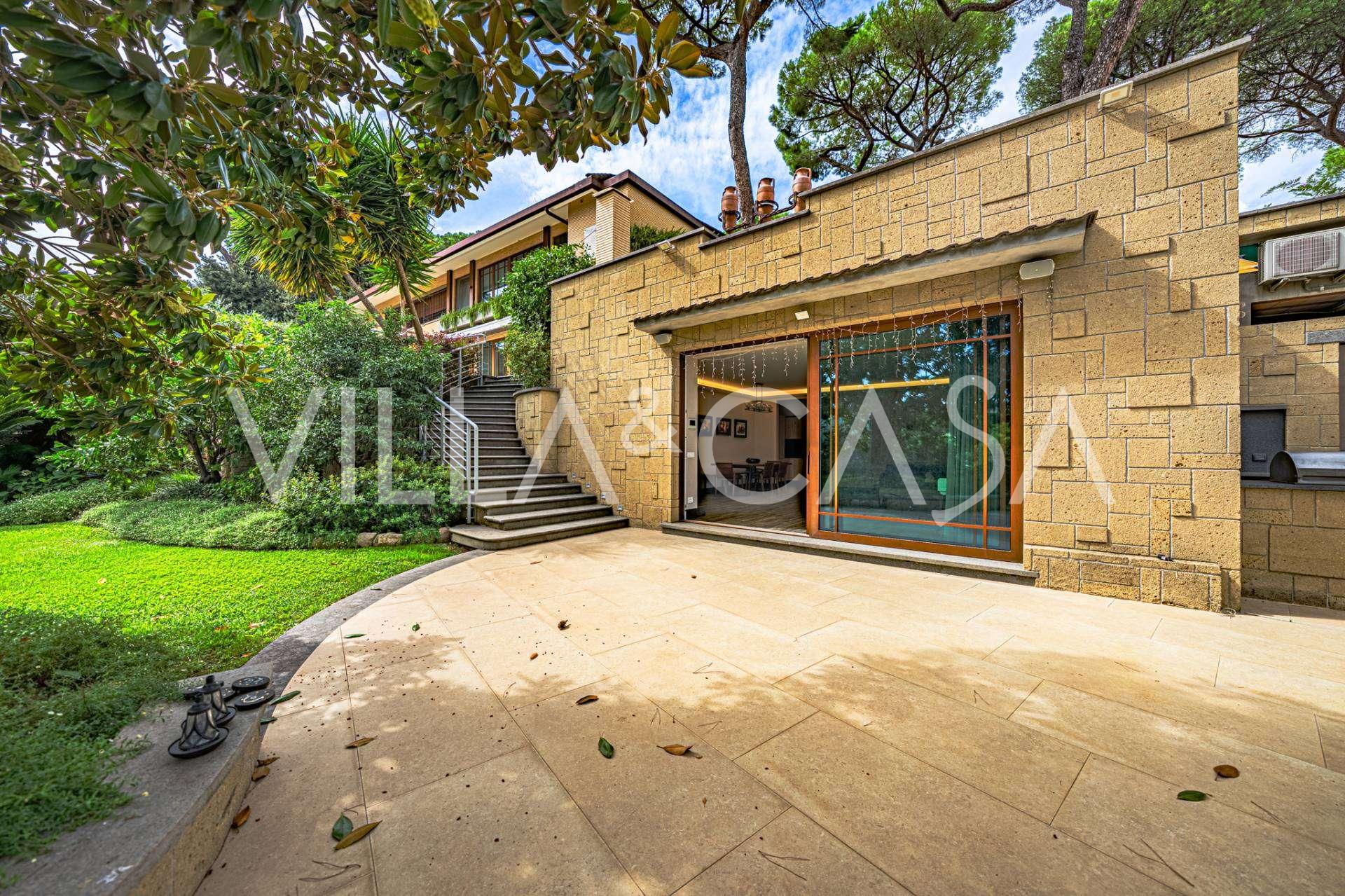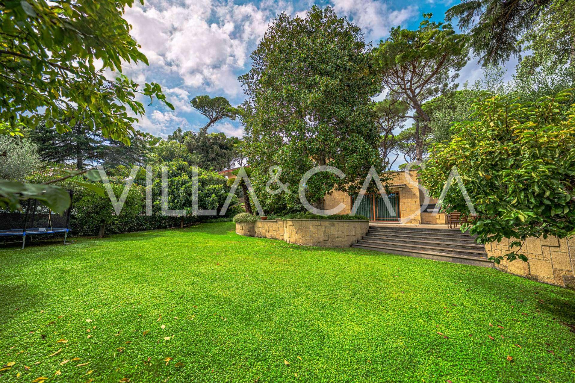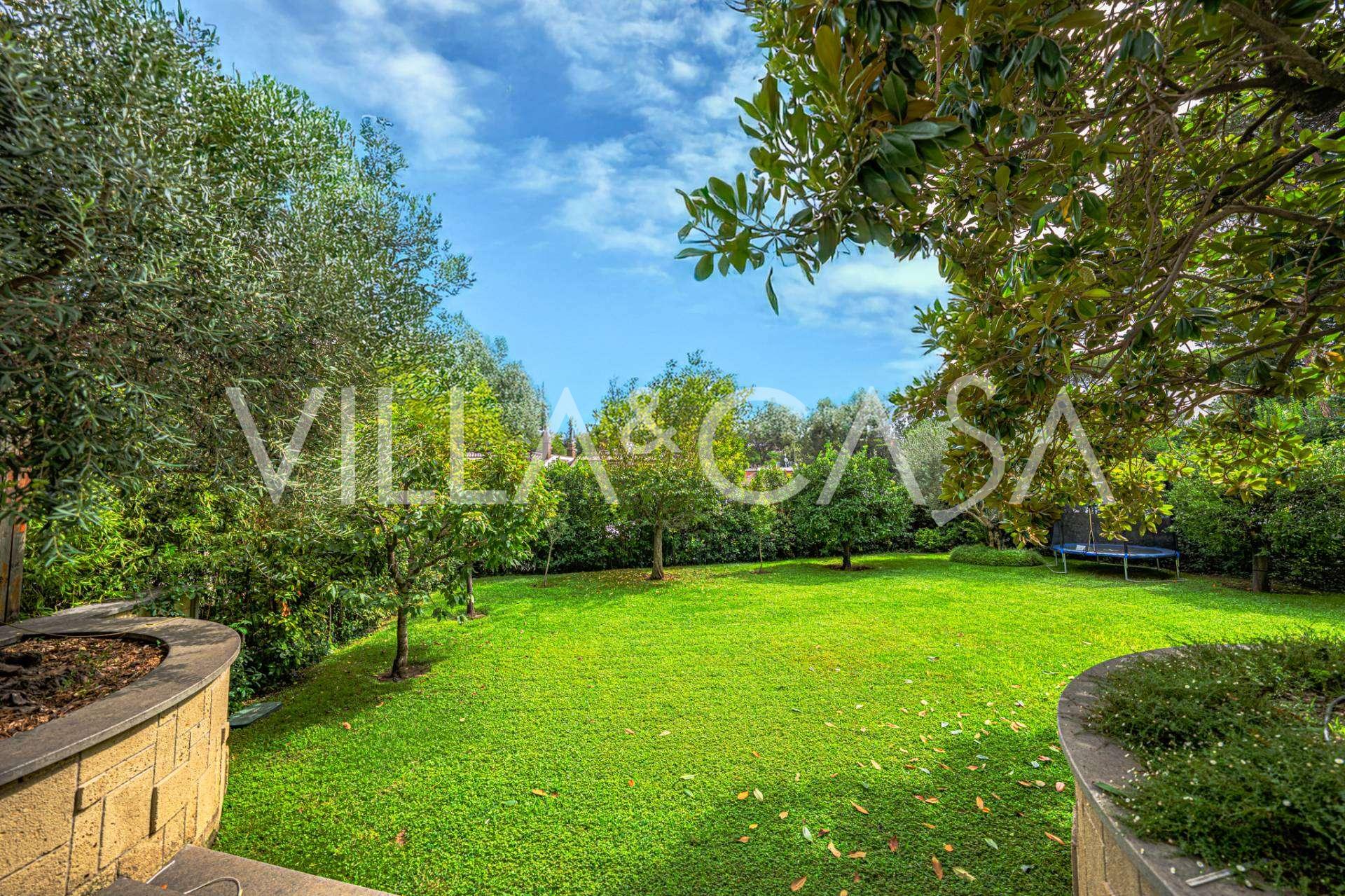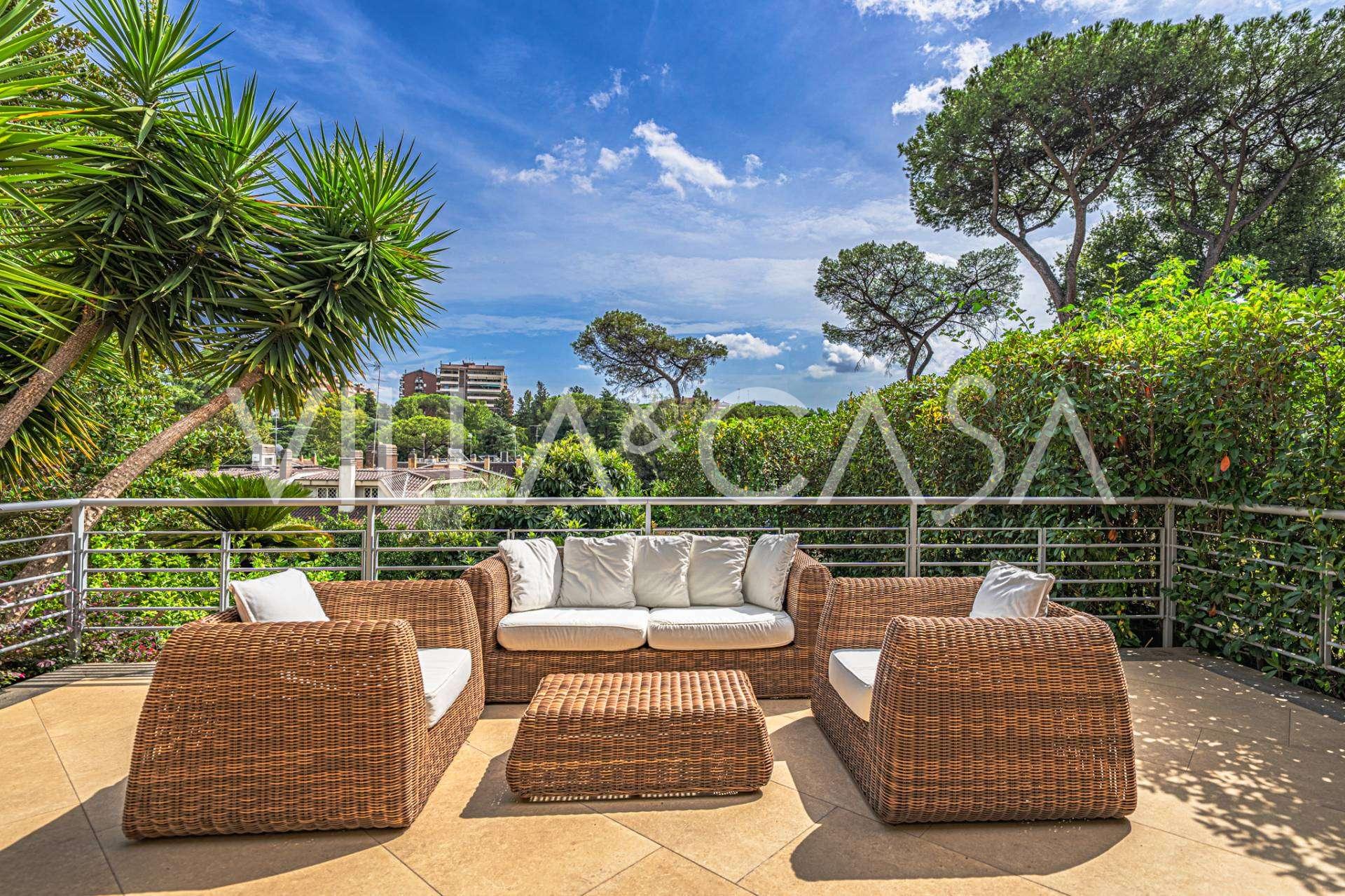 Detaylara özel dikkat gösterilerek oluşturulmuş peyzajlı bahçe, muhteşem bir manolya ve asırlık bir zeytin ağacı gibi nadir ağaç türleriyle süslenmiştir. Ana avlu birkaç aracı barındırabilir ve ayrıca bir araçlık kapalı bir garaj bulunmaktadır. Rezidansın mükemmel konumu, nadir bir sessizlik ve stratejik bir konum sunmaktadır: ana hizmetler ve EUR gölü ile parka kolay erişim sağlayan yolların yanı sıra Laurentina ve Cristoforo Colombo bulvarlarına yakın bir mesafededir. Roma'nın merkezine sadece birkaç dakikada ulaşılabilir.